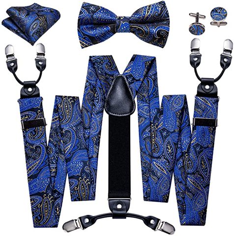 Dynastyle Men Paisley Suspender and Bow Tie Set with Floral Pocket Square Cuff Links Y Shape 6 Clips Braces